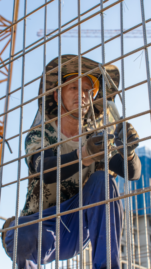 暴曬下的鋼筋表面十分燙手,站在邊上都能感覺(jué)到熱度。來(lái)自六安的程振合和李中俊作為鋼筋工能手正頭頂烈日,在鋼筋叢林中“穿針引線(xiàn)”。李中俊一手固定住鋼筋,一手熟練地用工具把鋼筋綁扎好。這樣的動(dòng)作,他每天都要重復無(wú)數次。