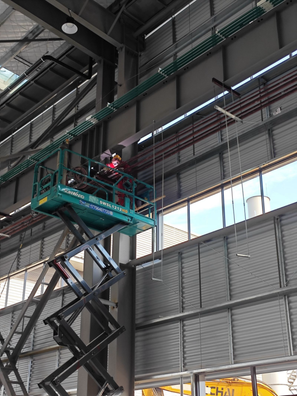 建工安裝合肥分公司施工內容涉及2#重鋼車(chē)間主次構安裝、圍護系統、門(mén)窗、防火涂料、通風(fēng)氣樓和機電安裝工程(裝飾裝修、工藝管線(xiàn)、消防、給排水、電氣、通風(fēng)空調等)。為保質(zhì)保量完成施工任務(wù),分公司派駐分管領(lǐng)導現場(chǎng)駐點(diǎn),項目管理團隊日夜跟進(jìn),施工人數達到100多人,曲臂車(chē)、登高車(chē)等各種現場(chǎng)施工機械達60余輛。本項目留給機電安裝工期緊任務(wù)重,項目全體人員日夜奮戰,最終刷新15日大面完工耀眼戰績(jì),為基地順利投產(chǎn)奠定堅實(shí)基礎。