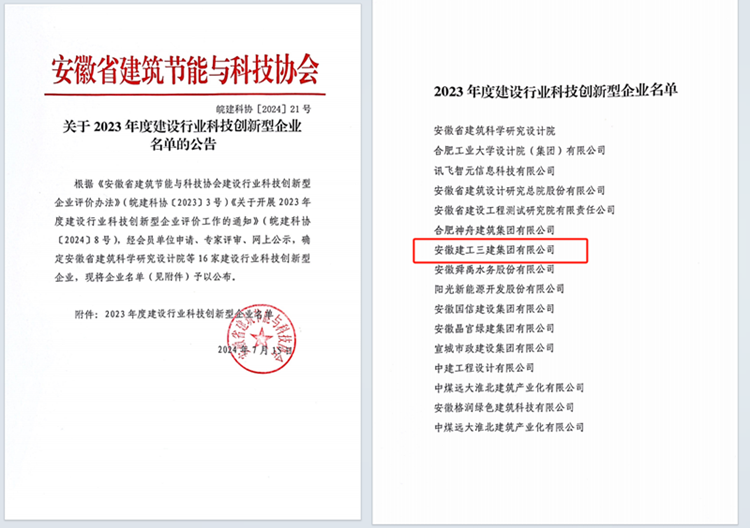 近日,安徽省建筑節能與科技協(xié)會(huì )公布“2023年度建設行業(yè)科技創(chuàng )新型企業(yè)”名單,安徽建工三建集團作為唯一一家省屬?lài)惺┕て髽I(yè)榮登榜單。