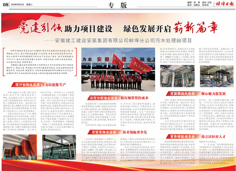 近年來(lái),安徽建工建設安裝集團有限公司蚌埠分公司充分發(fā)揮黨建引領(lǐng)作用,促進(jìn)項目發(fā)展,深入挖掘綠色環(huán)保領(lǐng)域市場(chǎng),在推動(dòng)經(jīng)濟社會(huì )發(fā)展全面綠色轉型和改善環(huán)境質(zhì)量方面履行社會(huì )責任,彰顯國企擔當。