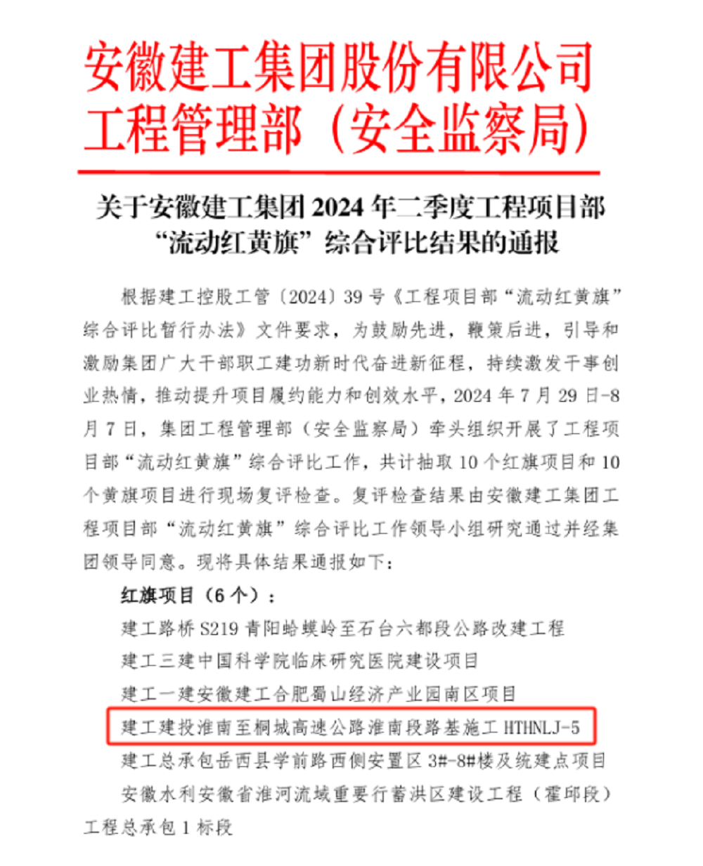日前,建工建投淮桐高速路基05標項目在集團“流動(dòng)紅黃旗”工程項目評比中表現優(yōu)異,榮獲2024年二季度“流動(dòng)紅旗項目部”稱(chēng)號。