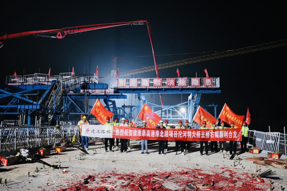 沱河特大橋是徐淮阜高速淮北段項目重點(diǎn)控制性工程,橋長(cháng)1026米,其中主橋長(cháng)270米,為單箱懸臂現澆箱梁。中跨合龍段是整個(gè)橋梁結構的關(guān)鍵部分,其澆筑完成意味著(zhù)橋梁主體結構即將連為一體,為后續的橋面鋪裝、附屬設施安裝等工序創(chuàng )造了有利條件,也為全線(xiàn)總體進(jìn)度穩步推進(jìn)奠定了堅實(shí)基礎。