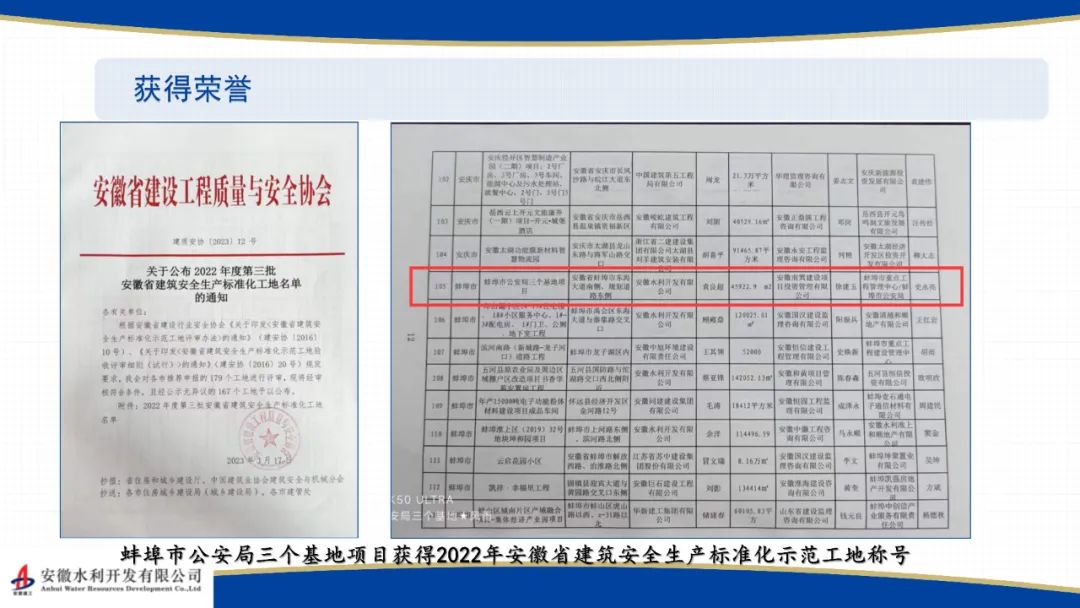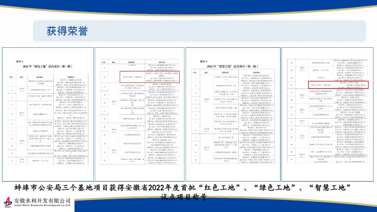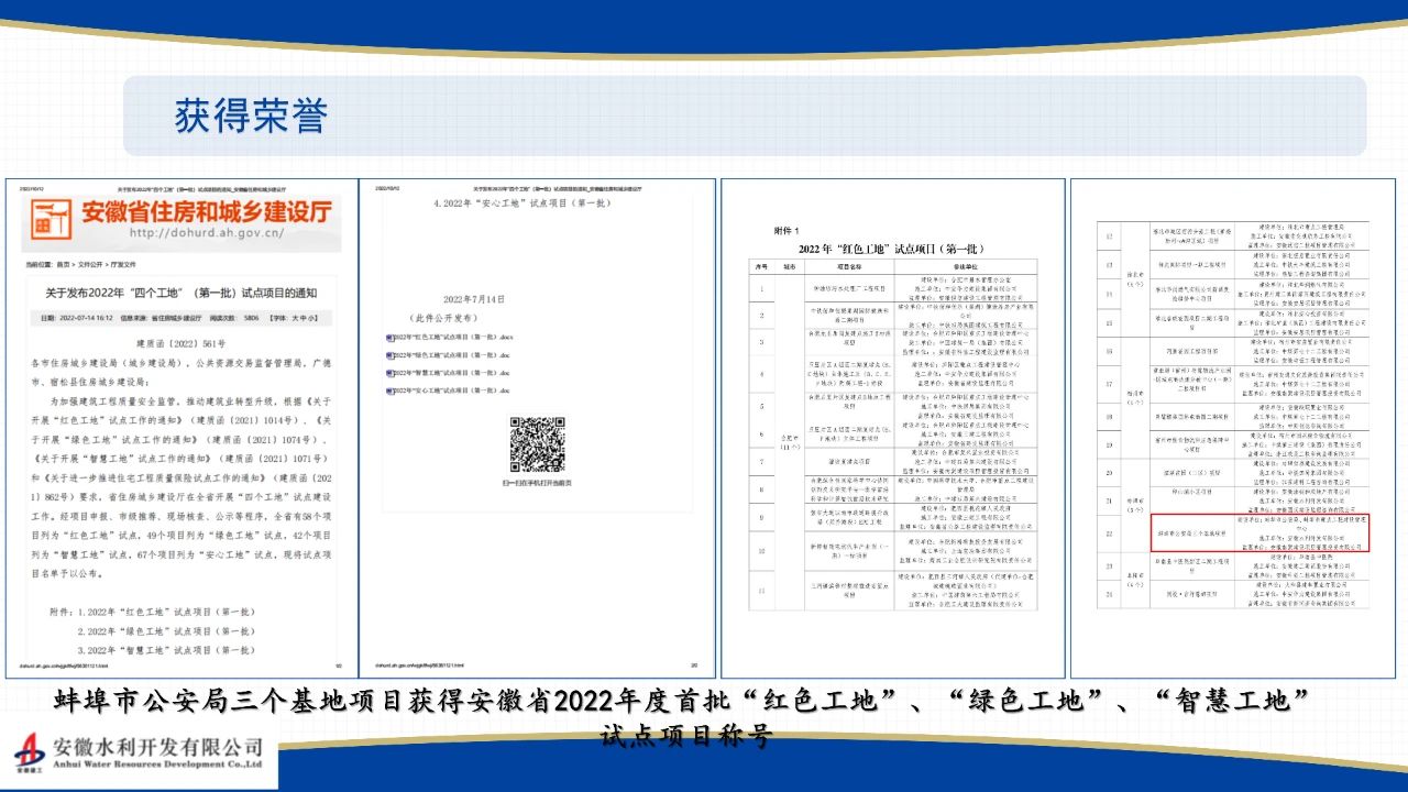 建設過(guò)程中,項目成功創(chuàng )建安徽省首批“智慧工地”“綠色工地”和“紅色工地”,先后榮獲集團公司“勞動(dòng)競賽優(yōu)勝項目部”、蚌埠市“青年文明號”等榮譽(yù),并順利通過(guò)省級、市級、集團級安全生產(chǎn)標準化示范工地和蚌埠市質(zhì)量標準化工地驗收。