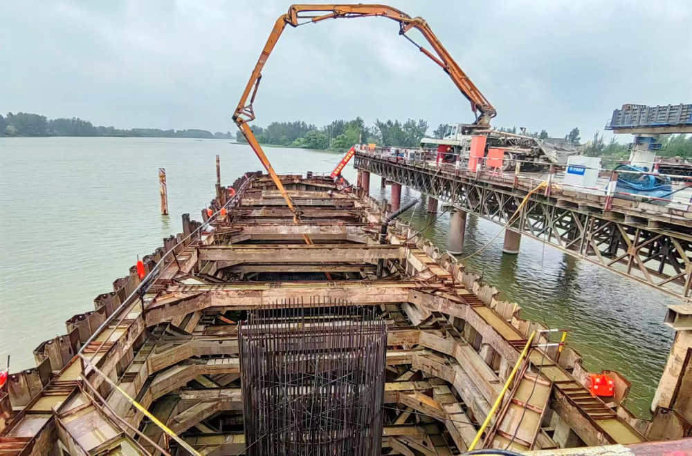 渦河大橋北岸主墩承臺鋼圍堰在8月8日成功封底施工后,歷經(jīng)19天的樁頭鑿除、鋼筋綁扎等緊張施工,8月27日中午正式開(kāi)始承臺第一層混凝土澆筑。承臺混凝土分1次澆筑,分層澆筑分層振搗,此次澆筑厚度為3.5米,單個(gè)承臺澆筑920立方米。