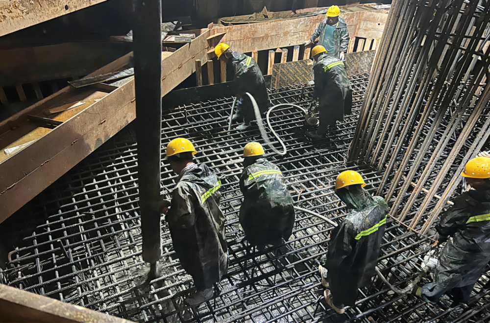 持續的陰雨天氣導致渦河圍堰底部潮濕寒冷、河水水位上漲、施工難度增大,項目一線(xiàn)人員輪班堅守、攻堅克難,確保澆筑順利進(jìn)行。
