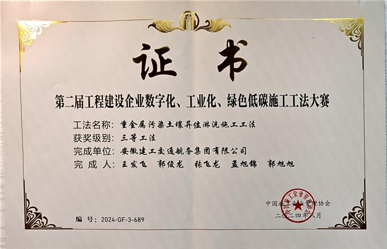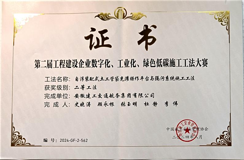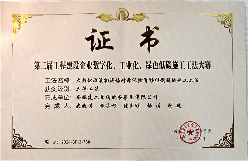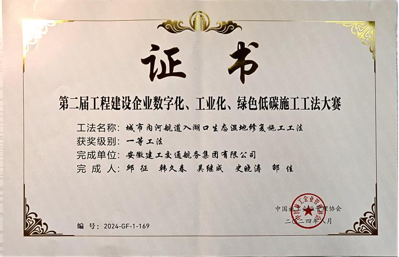 在工程建設企業(yè)“數字化、工業(yè)化、綠色低碳”施工工法大賽中,公司申報的“城市內河航道入湖口生態(tài)濕地修復施工工法”、“自浮裝配式土工管袋充灌操作平臺與隔污系統施工工法”、“重金屬污染土壤異位淋洗施工工法”、“大面積疏浚排泥場(chǎng)對稱(chēng)沉降滑移控制筑堤施工工法”分別榮獲一等獎、二等獎、三等獎。