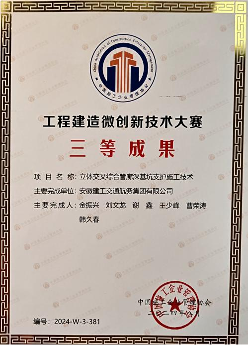 9月9日至11日,中國施工企業(yè)管理協(xié)會(huì )召開(kāi)了第六屆工程建設行業(yè)科技創(chuàng )新大會(huì ),發(fā)布了第四屆工程建設行業(yè)高推廣價(jià)值專(zhuān)利大賽、第四屆工程建造微創(chuàng )新技術(shù)大賽、第二屆工程建設企業(yè)“數字化、工業(yè)化、綠色低碳”施工工法大賽的成果,建工交航斬獲多項榮譽(yù)。
