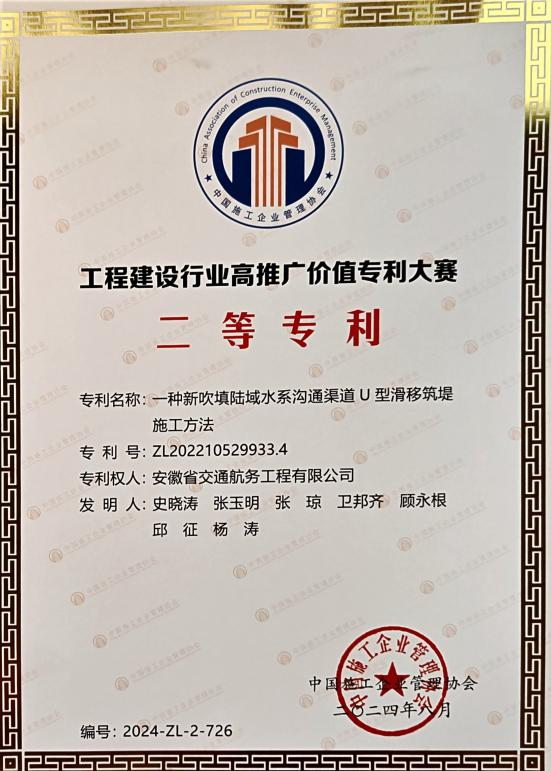 在工程建設行業(yè)高推廣價(jià)值專(zhuān)利大賽中,公司申報的“一種新吹填陸域水系溝通渠道U型滑移筑堤施工方法”發(fā)明專(zhuān)利榮獲二等獎。