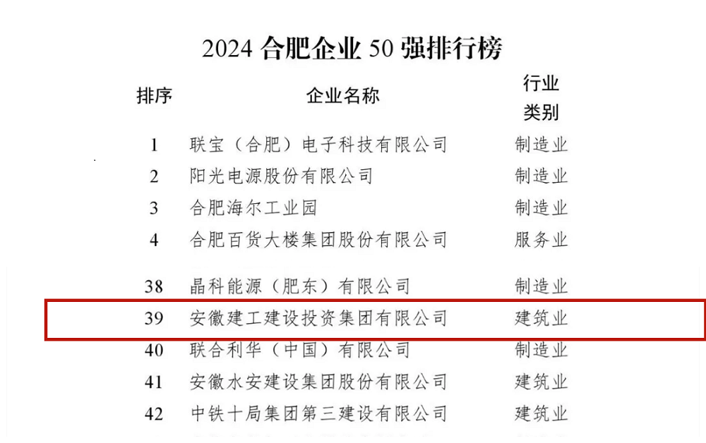 2024年9月22日,合肥市企業(yè)(企業(yè)家)聯(lián)合會(huì )發(fā)布2024合肥企業(yè)50強榜單。憑借出色的綜合實(shí)力,建工建投集團連續三年入選!