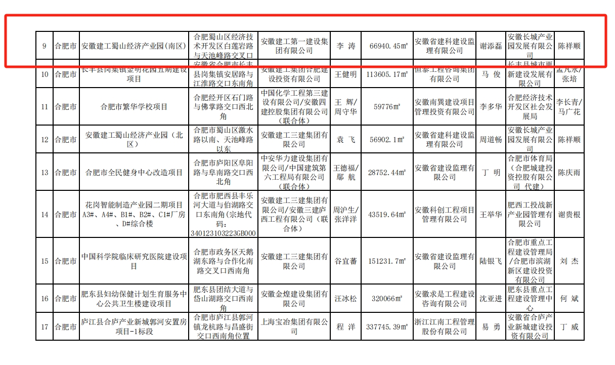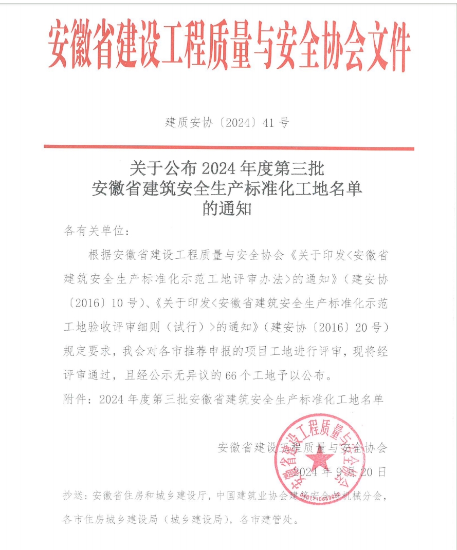 近日,安徽省建設工程質(zhì)量與安全協(xié)會(huì )發(fā)布2024年度第三批安徽省建筑安全生產(chǎn)標準化工地名單,建工一建合肥建投安徽建工蜀山經(jīng)濟產(chǎn)業(yè)園(南區)項目獲得“安徽省建筑安全生產(chǎn)標準化工地”榮譽(yù)稱(chēng)號。