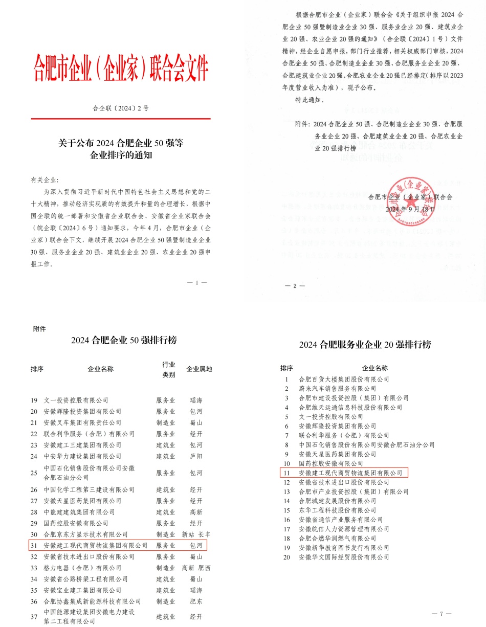 近日,合肥市企業(yè)(企業(yè)家)聯(lián)合會(huì )發(fā)布了2024合肥企業(yè)50強、合肥服務(wù)業(yè)企業(yè)20強榜單,建工商貿物流連續四年入選,分別位列第31位和第11位。