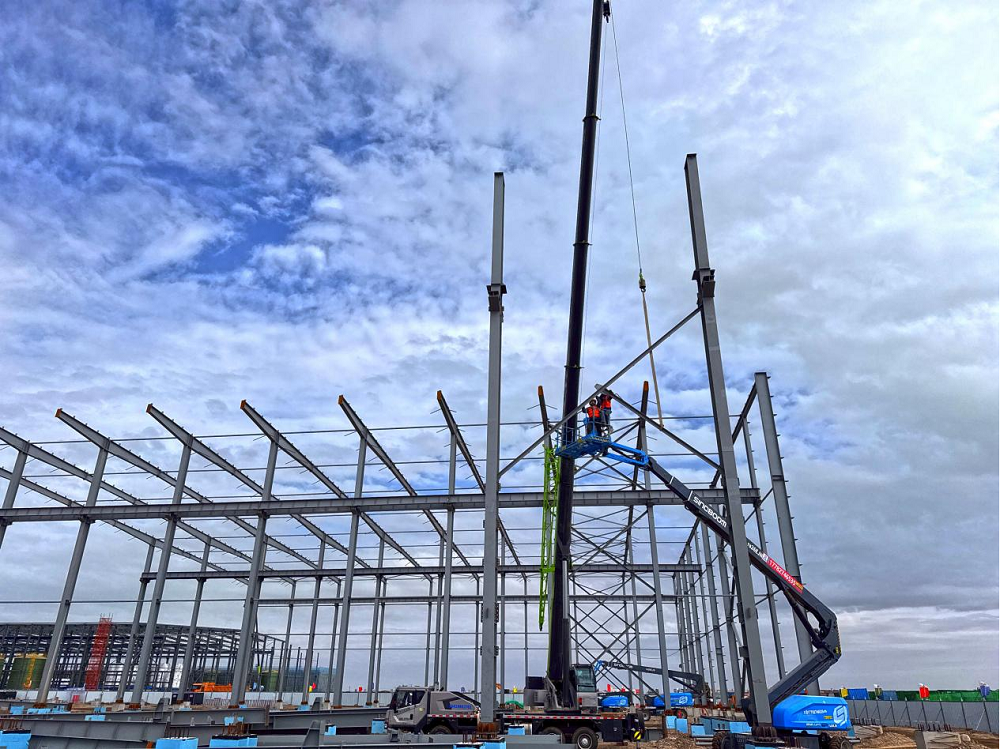 截至目前,廠(chǎng)房鋼結構完成1500噸建設量,獨立基礎、條形基礎全部完成,設備基礎正在施工;變電所二層主體施工完成,三層主體正在施工。