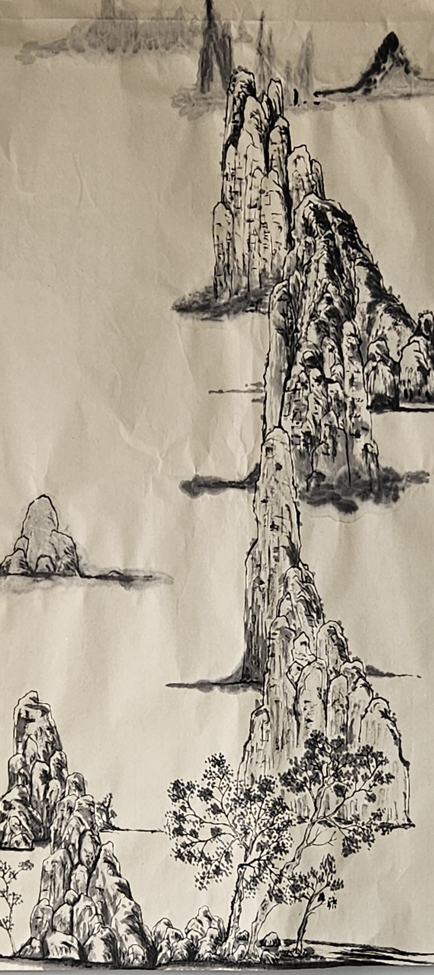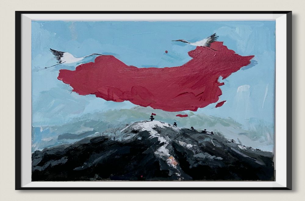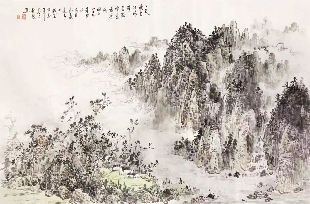 遠山含黛,層巒疊嶂,輕柔筆觸,勾勒出連綿山脈,宛如祖國脊梁,堅韌挺拔;淡雅墨色,潺潺流溢于山間河流,穿梭群峰,恰似母親秀發(fā),柔美飄逸,將對祖國母親的熱愛(ài)與敬仰,融入一筆一劃。