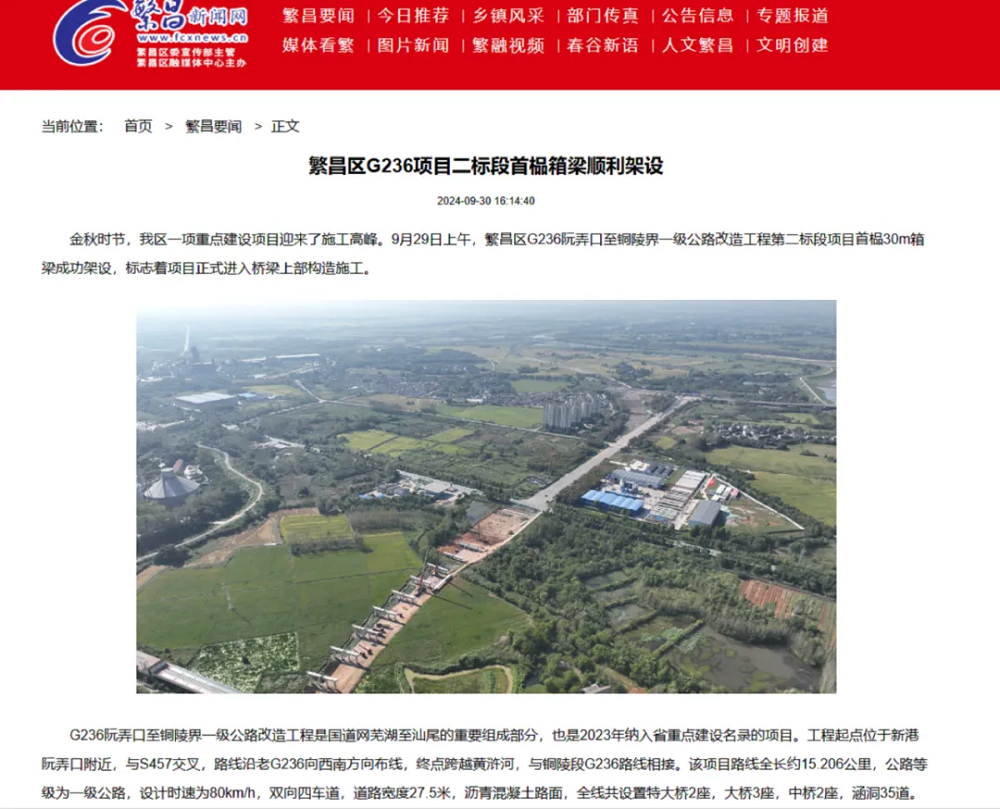 近日,“繁昌新聞網(wǎng)”、“繁昌發(fā)布”視頻號報道由建工建投集團承建的繁昌區G236項目二標段首榀30m箱梁順利架設。
