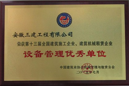 從8月14日在江蘇無(wú)錫召開(kāi)的“中國建筑業(yè)協(xié)會(huì )機械管理和租賃分會(huì )第七屆會(huì )員代表大會(huì )暨2015年年會(huì )”上獲悉,安徽三建工程有限公司榮獲“第十三屆全國設備管理優(yōu)秀單位”稱(chēng)號。這也是該公司連續第四次榮獲該項殊榮。安徽三建所屬設備租賃公司副經(jīng)理朱玉于會(huì )上獲得“全國建筑施工企業(yè)、建筑機械租賃企業(yè)設備管理優(yōu)秀經(jīng)理”表彰。