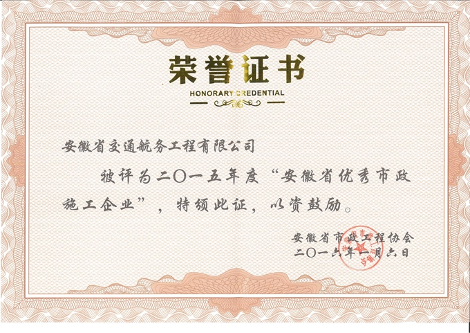 日前,在安徽省市政工程協(xié)會(huì )發(fā)布的2015年度40家安徽省優(yōu)秀市政施工企業(yè)和66位市政優(yōu)秀項目經(jīng)理名單中,安徽省交通航務(wù)工程有限公司榜上有名,安徽交航方申柱同志同時(shí)被評為2015年度安徽省市政施工企業(yè)優(yōu)秀項目經(jīng)理。