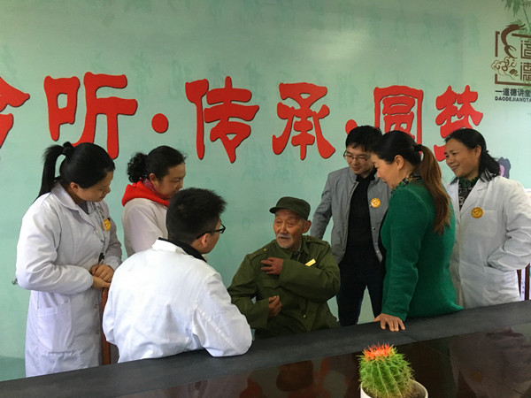 志愿者代表戚濤首先代表安徽三建全體職工對老人們表達了誠摯的問(wèn)候和祝福。他說(shuō),金寨縣光榮院居住著(zhù)紅失人員、老復員軍人等,每一個(gè)老人都是中國革命史的締造者,我們要從他們身上繼承愛(ài)國主義的優(yōu)良傳統。青年團員向光榮院贈送了收音機、象棋、水果等慰問(wèn)品。隨后,老人們請青年團員去看看自己的屋子,并指著(zhù)墻上的照片講起戰爭年代的故事,團員們團團圍住老人聽(tīng)得專(zhuān)注而又入神。最后,來(lái)自安徽三建社區衛生服務(wù)中心的醫生們開(kāi)展健康義診,各位老人依次進(jìn)行健康咨詢(xún),并進(jìn)行了血壓檢測等簡(jiǎn)單的健康檢查,醫生還叮囑他們要按時(shí)吃藥、保重身體。