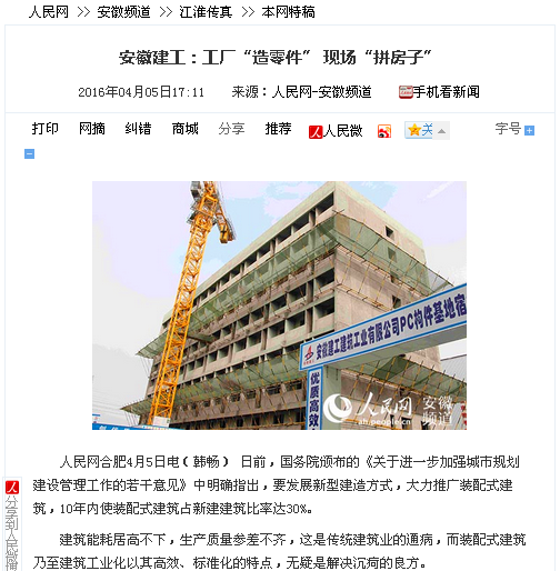 4月5日,人民網(wǎng)安徽頻道刊登名為《安徽建工:工廠(chǎng)“造零件”現場(chǎng)“拼房子”》的新聞報道,對安徽建工產(chǎn)業(yè)化建設及首個(gè)裝配式產(chǎn)業(yè)化工程進(jìn)行了報道介紹。