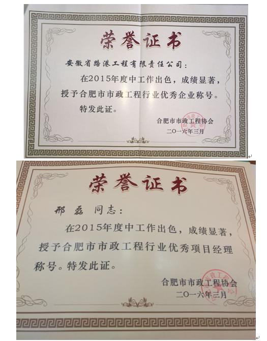 近日,安徽省路港工程有限責任公司榮獲2015年度“合肥市市政工程行業(yè)優(yōu)秀企業(yè)”稱(chēng)號,邢磊同志被授予2015年度“合肥市市政工程行業(yè)優(yōu)秀項目經(jīng)理”稱(chēng)號。