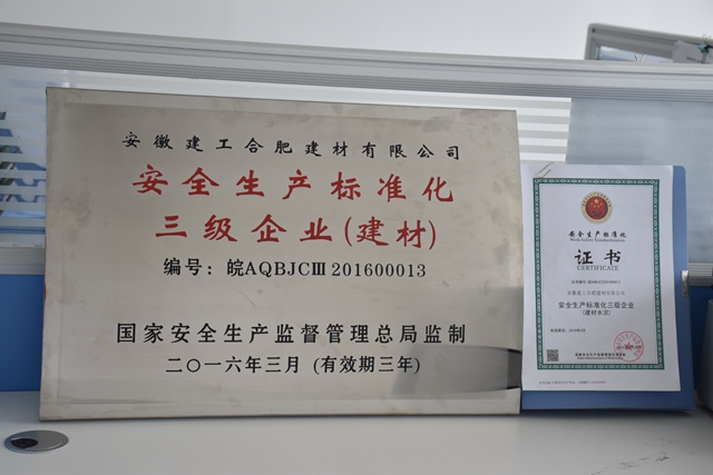 2016年1月15日,安徽建工合肥建材有限公司(以下簡(jiǎn)稱(chēng)合肥建材)順利通過(guò)肥西縣安監局、桃花工業(yè)園管委會(huì )安監局及安全標準化評審專(zhuān)家組的現場(chǎng)驗收和評審;2016年3月28日,報經(jīng)合肥市安全生產(chǎn)監督管理局核準;2016年6月8日,合肥建材被合肥市安全生產(chǎn)監督管理局授予“安全生產(chǎn)標準化三級企業(yè)(建材)”稱(chēng)號,并頒發(fā)證書(shū)和銘牌。