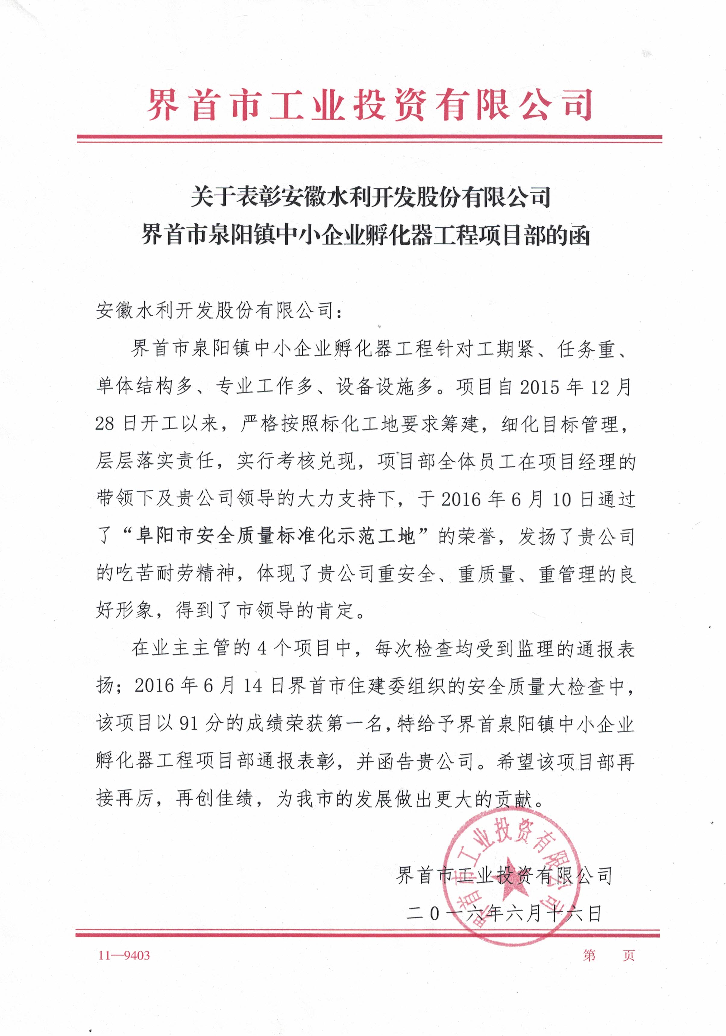 安徽水利界首市泉陽(yáng)鎮中小企業(yè)孵化器工程受到業(yè)主通報表彰