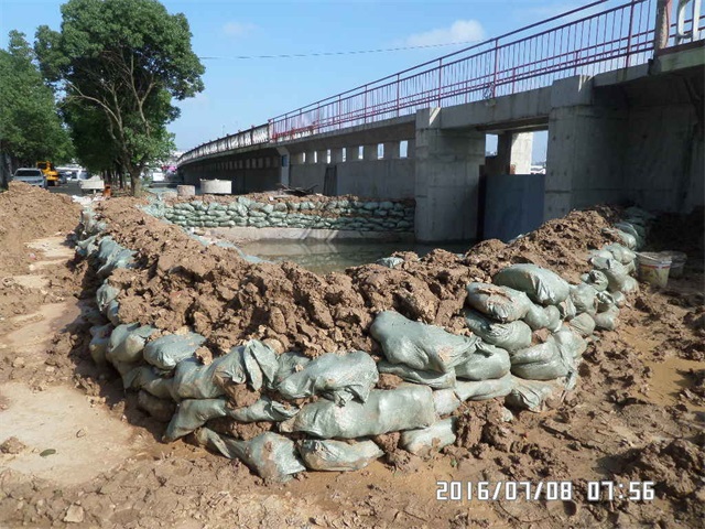 蕪湖市機電排澇站處通江閘改造原不屬于安徽路港蕪申運河城區段02標項目部項目清單范圍內施工任務(wù),為新增施工項目,該項目部部已于2015年10月全部完成通江閘改造及原有閘門(mén)安裝工程。但弋江區防汛指揮部在2016年7月5日下午巡查時(shí)發(fā)現通江閘閘門(mén)處由于原有閘門(mén)橡膠墊老化,導致部分滲水,隨即緊急召集項目部等相關(guān)單位研討處理方案。之后,蕪申運河02標項目部立即展開(kāi)應急行動(dòng),從安徽路港銅陵路高架項目部、巢湖閘錨地工程項目部調轉人員和機械設備連夜搶工,于7月6日早完成了對墻內的圍堰設置,以確保城區汛期安全。