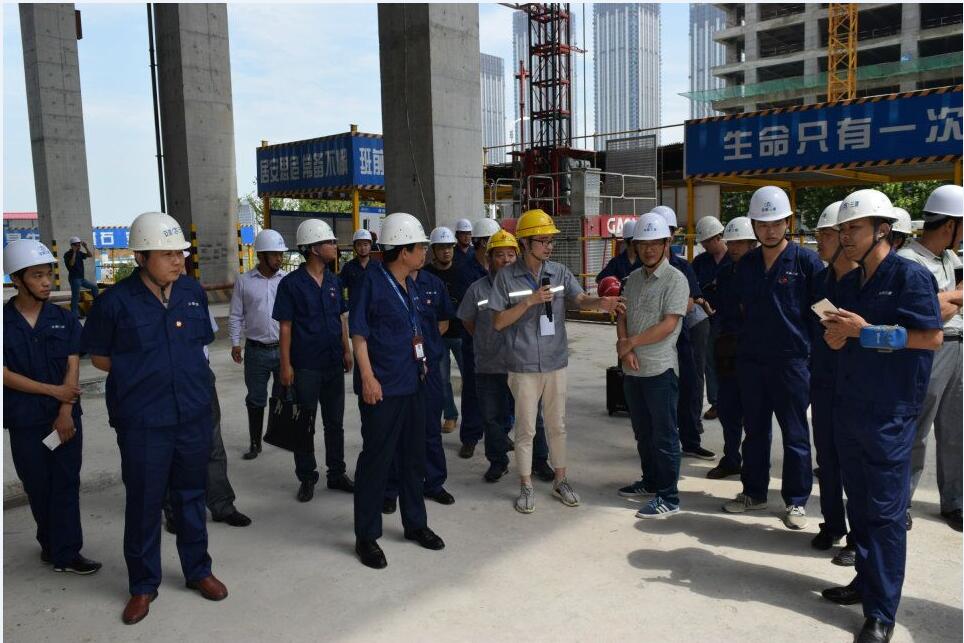 7月7日下午八分公司組織項目經(jīng)理、技術(shù)負責人、施工負責人、質(zhì)量負責人、安全負責人對中天集團有限公司承建的安徽省農村信用社聯(lián)合社信息技術(shù)服務(wù)樓1#樓(建筑高度180米)超高層進(jìn)行觀(guān)摩學(xué)習。深入了解中天集團超高層施工難點(diǎn)、整體式全鋼爬架施工工序搭接、超高層泵送混凝土布管、費用,大型設備投入及使用情況。