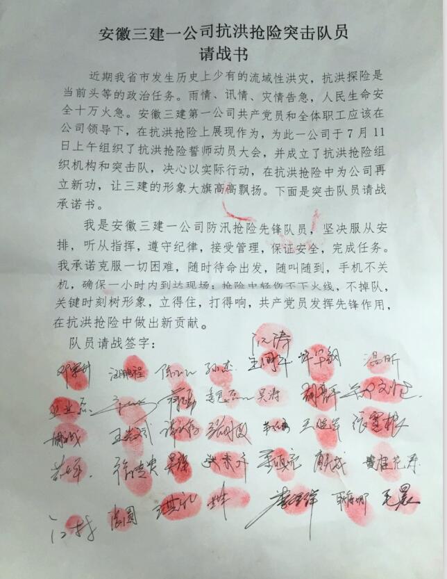 在這封“請戰書(shū)”上,安徽三建一分公司所轄合肥項目部全體職工依次鄭重署名,摁下紅彤彤的手印,恰是一道無(wú)聲的動(dòng)員令。他們紛紛表示,急切盼望能奔赴抗洪救災第一線(xiàn),只要災區需要,公司一聲令下,大家時(shí)刻整裝待發(fā)。