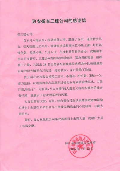 安徽三建在此次救災搶險工作中,積極踐行“兩學(xué)一做”,充分發(fā)揮了黨組織戰斗堡壘作用和共產(chǎn)黨員先鋒模范作用,完美體現了安徽三建“重信興利 服務(wù)社會(huì )”的企業(yè)宗旨,以堅強的意志和過(guò)硬的素質(zhì)迎戰洪水,彰顯了公司強烈的社會(huì )責任感,贏(yíng)得社會(huì )一片好評。