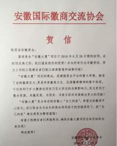 項目現場(chǎng)熱鬧非凡、彩旗飄飄,進(jìn)入慶典現場(chǎng)首先映入眼簾的是醒目的對聯(lián):戰嚴寒酷暑高速優(yōu)質(zhì)彰顯徽商精神;品古城風(fēng)韻方正儒雅喜添安徽大廈。參加封頂儀式的主要領(lǐng)導有陜西省安徽商會(huì )會(huì )長(cháng)張金龍、秘書(shū)長(cháng)黃德明、西安市人大常委會(huì )原黨組書(shū)記施啟文、榮譽(yù)會(huì )長(cháng)丁盈川、徽商投資集團董事局主席吳海杰、安徽大廈籌建組組長(cháng)朱滿(mǎn)忠;安徽三建及安徽水利西北公司主要負責人及商會(huì )常務(wù)副會(huì )長(cháng)、副會(huì )長(cháng)、全體業(yè)主、在陜異地商會(huì )多家秘書(shū)長(cháng)等300余人出席了封頂慶典儀式。安徽國際徽商交協(xié)會(huì )及外省兄弟商會(huì )也紛紛發(fā)來(lái)賀電。
