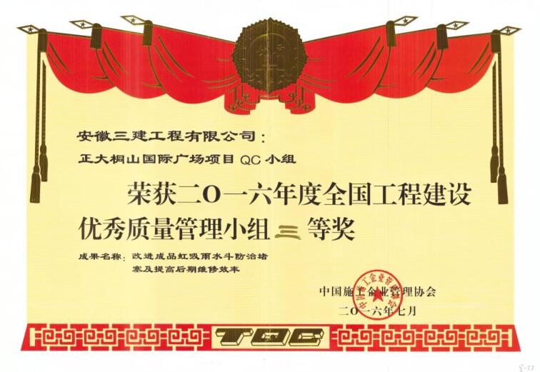 近日,從中國施工企業(yè)管理協(xié)會(huì )傳來(lái)喜訊,安徽三建安裝公司正大桐山國際廣場(chǎng)項目QC小組榮獲2016年度全國工程建設優(yōu)秀質(zhì)量管理小組三等獎,這是安裝公司繼去年獲得全國QC小組獎項的又一重要獎項。